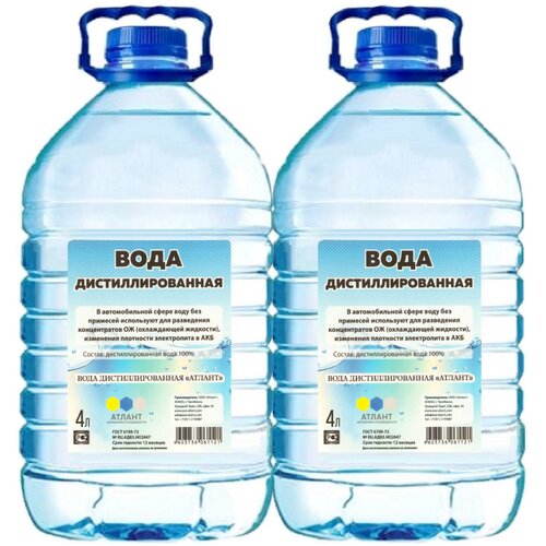 Вода дистиллированная атлант 2 ПЭТ бутылки по 4 литра.Вода очищенная от растворённых в ней минеральных солей, органических веществ и других примесей путём дистилляции по госту.Применяется: Для разведения электролита в аккумуляторных батареях. Для разбавления концентрированного антифриза, тосола, стеклоомывателя. Для промывания жидкостной системы охлаждения и омывателя стекол. Для глаженья белья при помощи утюга, парогенератора, отпаривателя. Для моющего пылесоса, пароочистителя, паровой швабры. Для промывки этих и др. приборов. Для мойки стеклянных поверхностей. Для системы кондиционирования и охлаждения, для увлажнителя воздуха, очистителя воздуха, концентратора кислорода, систем отопления и контура охлаждения. Гидропоника растений. Аквауримистика, заливка в аквариум в пропорции 2:1. В кулинарии, для приготовления эксклюзивных блюд, льда, напитков, коктейлей, кофе, разбавления красителей и концентратов. Для разбавления самогона, спирта, настойки. В автоклавных установках и паровых стерилизаторах. В медицине и косметологии: при, изготовлении лечебных растворов для полоскания, для ингаляций с использованием небулайзера и ингалятора. Для СИПАП Аппарата. Для ирригатора. При изготовлении крема, мази, гели, туалетной воды и пр при изготовлении различных растворов, при разбавлении концентратов, которые требуют чистоты и точности дозировок. Для подготовки и разведения хим. реактивов, изготовления калибровочных буферных растворов. При производстве жидких удобрений, для точной дозировки разводимых минеральных веществ.• Если в приборе ранее использовалась вода с повышенным содержанием солей, есть вероятность выделения отложений. Рекомендуем пропустить некоторое количество воды для очистки прибора.• Дистиллированная вода чище чем деминерализированная и умягченная вода. Поливать растения в неразбавленном виде не рекомендуется. Пить дистиллированную воду в не разбавленном виде можно, но не регулярно. При систематическом употреблении Дистиллированная вода способна выводить из организма, и растений, питательные вещества и микроэлементы, в т. ч. и полезные. *(Проконсультируйтесь с врачом).• Товар сертифицирован, поставляется непосредственным производителем, полностью соответствует указанным характеристикам на фото протокола испытаний и документам качества.• Дистиллированная вода Атлант используется не только в быту, но и в производственных объемах, на предприятиях химической и парфюмерной промышленности. Вода производится на современном оборудовании, по технологии в четыре этапа, основой которой является 2х-ступенчатый обратный осмос под постоянным, лабораторным контролем качества.• Товар упакован в биоразлогаемую пленку, имеющую специфический оттенок и шероховатость.• Гарантия от производителя!