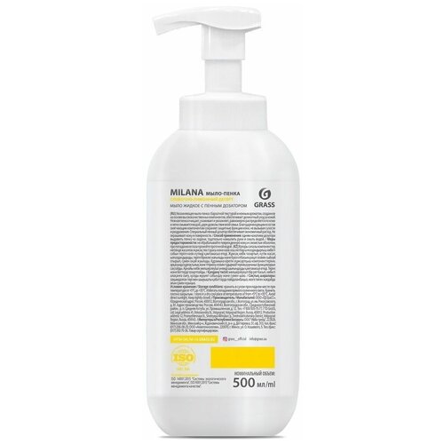 Жидкое мыло пенка для рук GRASS MILANA ГраСС 500 мл лимонный пирог, мыло с бархатной текстурой и нежным ароматом, созданное на основе высококачественных компонентов, обеспечивает деликатный уход за кожей, оставляя после мытья на руках ощущение свежести и гладкости кожи. Также подходит, как детское жидкое мыло. Нежная пенка Милана очищает, ухаживает и увлажняет, равномерно распределяется по коже и легко смывается водой, даря удовольствие всей семье. Смягчающие компоненты в составе мыла пенки сохраняют защитные функции кожи, не вызывая сухости и раздражения. Специальный пенный дозатор обеспечивает экономичный расход. Мыло пенка используется для дозатора или диспенсера. Наше мыло гипоаллергенное.