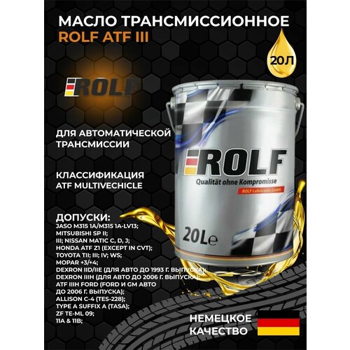 Масло для автоматических трансмиссий Rolf ATF Multivehicle 20 л 322380 - высокоэффективная трансмиссионная жидкость для автоматических трансмиссий ROLF ATF MULTIVEHICLE изготовлена на основе синтетических базовых масел и многофункционального пакета присадок последнего поколения, что обеспечивает заданный коэффициент трения для передачи высокого крутящего момента, значительно снижает износ и предотвращает задиры. Обладает превосходными противоизносными и противозадирными свойствами, что обеспечивает защиту на весь срок службы масла. Обеспечивает оптимальный коэффициент трения, за счёт чего достигается плавность переключения передач.