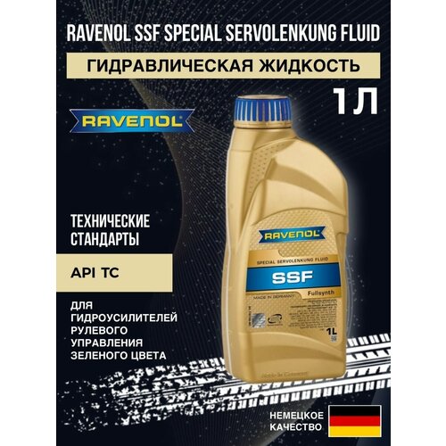 RAVENOL SSF Special Servolenkung Fluid полностью синтетическая специальная гидравлическая жидкость. Благодаря специально разработанной рецептуре, RAVENOL SSF Special Servolenkung Fluid обладает превосходными эксплуатационными характеристиками и гарантирует прекрасную устойчивость при холодных температурах. Низкотемпературные свойства позволяют применять специальную жидкость RAVENOL SSF Special Servolenkung Fluid круглогодично, включая экстремально холодную зиму при температурах в диапазоне от -40°С до +100°С. Производится согласно требованиям VW-Norm TL 52146 и предназначена для гидроусилителей рулевого управления автомобилей, гидропневматических подвесок с регулированием уровня, амортизаторов, систем стабильности и тяги, электро-гидравлических приводов крыши кабриолета, центральных замков для VW, Audi, Seat, Skoda. Особенно рекомендуется для применения при холодных температурах. Применение SSF Special Servolenkung Fluid обеспечивает: Чрезвычайно низкую температуру застыванияПрекрасные вязкостные и трибологические характеристикиПревосходную защиту от износаОтличную термостабильностьПрекрасные противоизносные свойстваЗащиту от пенообразованияНейтральное поведение по отношению к уплотнительным материаламХорошую защиту от коррозии