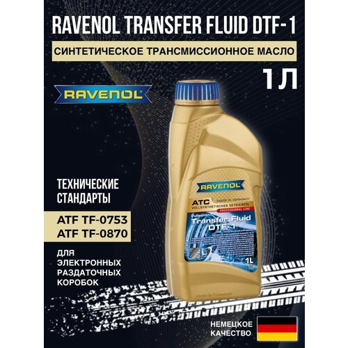 RAVENOL Transfer Fluid DTF-1 полностью синтетическое трансмиссионное масло на полиальфаолефинах (ПАО) для новейшего поколения электронных раздаточных коробок со специальным пакетом присадок. Гарантирует максимальную защиту от износа. Обладает стабильной вязкостью при высоких нагрузках. важно! Жидкость RAVENOL Transfer Fluid DTF-1 является сервисным продуктом, требующим профессионального подхода к выбору. Соблюдайте рекомендации автопроизводителя в плане подбора жидкости, порядка и периодичности её сменыБыло изменено наименование продукта, старое наименование RAVENOL Transfer Fluid TF-0870Применение Transfer Fluid DTF-1 обеспечивает: Стабильно высокий индекс вязкостиОтличные смазывающие свойства при низких температурах зимойНизкую температуру застыванияОтличные противоокислительные свойстваЗащиту от износа, коррозии и пенообразованияНейтральное отношение к уплотнительным материалам и материалам, не содержащим железоХороший коэффициент тренияНейтральное поведение по отношению к цветными металлам за счет ингибирования