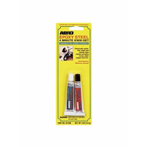 Клей эпоксидный высокопрочный 14,2 г. Производитель ABROИспользуется для химической сварки, заполнения, герметизации и склеивания дерева, пластика и большинства металлов, включая латунь, сталь, медь, железо, и т. п.свойства• Время схватывания — 4 минуты.• Создает сверхпрочное соединение.• Используется в качестве химической сварки.• Надежно склеивает детали и заполняет пустоты.• Содержит стальной порошок.• Устойчив к бензину, антифризу и большинству растворителей.• Может применяться для сломанных велосипедов, растрескавшихся картеров коробки передач, тормозных колодок, всасывающих труб, поврежденных шпоночных канавок, трещин в обшивке, растрескавшейся батареи, бензобаков.• Невоспламеняемый.• Склеенные изделия можно эксплуатировать при температуре от -40°С до +121°С.