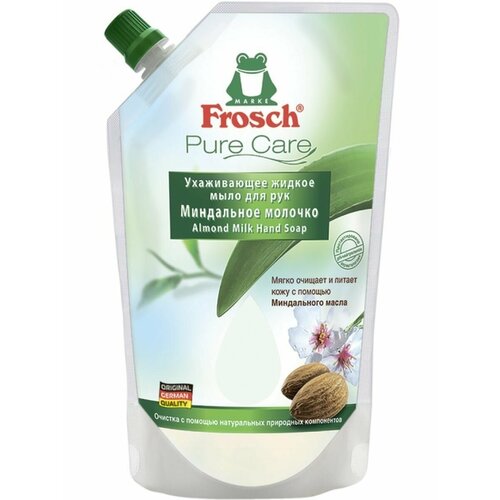 Frosch Ухаживающее мыло для рук Миндальное молочко (запасная упаковка), 500 мл. 1 шт. О заживляющем действии миндального молочка было известно еще при Клеопатре. Ухаживающее мыло Миндальное молочко марки Frosch, при создании которого были использованы эти знания, побалует вашу кожу особенно мягкими компонентами и позаботится о приятном и нежном уходе. Ваши руки приобретут красивый и ухоженный вид, а после мытья рук на них останется приятный аромат миндаля.