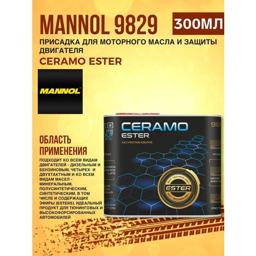 Присадка для моторного масла MANNOL Ceramo Ester 300мл - инновационное средство защиты двигателя на основе синтетических сложных эфиров – эстеров (масел V группы) и микрочастиц гексагонального нитрида бора h-BN (белого графита) – противоизносная и антифрикционная присадка к моторным маслам не содержащих сцеплений (фрикционов), работающих в масляной ванне. Подходит ко всем видам двигателей – дизельным и бензиновым, четырех- и двухтактным и ко всем видам масел – минеральным, полуcинтетическим, синтетическим, в том числе и содержащих эфиры (esters). Идеальный продукт для тюнинговых и высокофорсированных автомобилей.Представляет собой устойчивую суспензию графитоподобного микропорошка в эфире.Молекулы эфиров из присадки примагничиваются к металлическим поверхностям за счет своей ярко выраженной полярности и создают плотную и очень прочную масляную пленку, а микрочастицы керамики сглаживают неровности поверхностей трения и эффективно рассеивают тепло. Таким образом предотвращается непосредственный контакт металлических поверхностей и износ деталей даже в самых экстремальных условиях эксплуатации. Исключается сухое трение при холодном старте, особенно при отрицательных температурах и тем самым сводится к минимуму пусковой износ двигателя.Образующийся при применении средства граничный слой обладает следующими свойствами:- чрезвычайной устойчивостью к давлению – что позволяет двигателю и/или трансмиссии работать с повышенными нагрузками без отрицательных последствий;- непревзойденными противоизносными и антифрикционными свойствами, что значительно увеличивает ресурс двигателя и/или узлов трансмиссии и значительно экономит топливо и снижает шум двигателя;- антикоррозионными и антиокислительными свойствами.Присадка придает маслу следующие свойства:- предотвращает сухое трение;- снижает испаряемость, что снижает его расход на угар и продлевает срок службы масла;- повышает термоокислительную стабильность, что повышает его стойкость к старению и деградации за счет чего могут быть увеличены интервалы замены масла;- улучшает низкотемпературные свойства, что значительно облегчает холодный пуск;- улучшает моющие и диспергирующие свойства, предотвращает отложения лаков, смол и шлама – что увеличивает срок службы двигателя и/или трансмиссии и самого масла.Совместимость:- совместимо со всеми конструкционными материалами, сажевыми и самыми тончайшими (тонкой фильтрации) масляными фильтрами: размер частиц (не более 0,5 мкм) гарантирует их свободное прохождение через любые фильтры и исключает осаждение;- совместимо с катализаторами, всеми видами турбонагнетателей и со всеми системами впрыска, в т. ч. Common Rail.Применение: Встряхнуть и добавить в масло в соотношении 300 мл на 5 л.Внимание! Не подходит для применения в агрегатах, содержащих муфты сцепления (фрикционы), работающие в масляных ваннах.