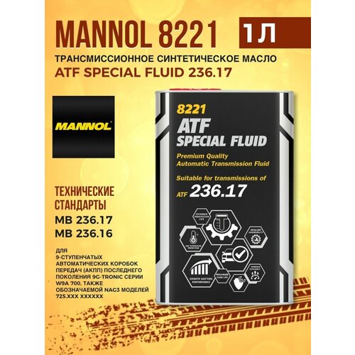 Масло трансмиссионное MANNOL ATF Special Fluid 236.17 1л - низковязкое трансмиссионное синтетическое ester-содержащее масло (ATF) специально разработанное для 9-ступенчатых автоматических коробок передач (АКПП) последнего поколения 9G-TRONIC серии W9A 700. Обеспечивает бесперебойную работу АКПП, гарантирует минимальный износ, продолжительный срок службы трансмиссий и экономию топлива.Свойства продукта:- Маловязкая смесь специальных синтетических базовых масел высочайшего качества со стабильно высоким индексом вязкости и синтетических сложных эфиров в комбинации с многофункциональным пакетом присадок сохраняет все свои свойства в широком диапазоне температур и нагрузок: обеспечивает хорошие смазочные свойства при экстремально низких температурах зимой благодаря низкой температуре застывания и обеспечивает стабильную масляную плёнку при экстремальных нагрузках и температурах летом;- Специальный инновационный высокотехнологичный пакет присадок в сочетании с эфирами обеспечивает экстраординарные антифрикционные и противоизносные свойства для пар трения и непревзойдённые фрикционные свойства для фрикционных элементов, что обеспечивает существенную экономию топлива, плавное без рывков переключение передач и увеличение срока службы всех элементов трансмиссии. Обеспечивает слаженную и плавную работу сцеплений;- Обладает повышенной устойчивостью к сдвигу;- Обладает повышенной термической, термоокислительной и химической стабильностью и стойкостью к высокотемпературной термической деградации, а также в целом к старению на протяжении всего срока эксплуатации. Это позволяет снизить образование шлама, лака, нагара и других углеродистых отложений, увеличить интервал замены масла и обеспечить долговечность деталей трансмиссии, что снижает затраты на обслуживание техники;- Полностью защищает от коррозии металлические детали из черных и цветных металлов и сплавов как в процессе работы, так и в нерабочем состоянии;- Обладает непревзойдёнными антипенными, антиаэрационными и охлаждающими свойствами;- Обеспечивает совместимость со всеми материалами уплотнений, предотвращает их разбухание, затвердевание и усадку, что позволяет снизить затраты на запчасти и предотвращает утечки;- Обеспечивает отличную совместимость с электронными элементами;- Способствует "управляемой потребностью" подаче масла двумя маслонасосами за счёт чего обеспечивается дополнительная топливная экономичность;- Снижает шум. Обеспечивает максимальный комфорт вождения за счёт увеличения динамики вождения при быстром переключении передач.Рекомендуется для АКПП последнего поколения 9G-Tronic (NAG3) автомобилей SSANGYONG для которых автопроизводитель предписывает использовать жидкости ATF 236.17. Масло также можно использовать в АКПП для которых автопроизводитель предписывает использовать жидкости ATF 236.16. Масло категорически недопустимо использовать для АКПП требующих масел старых спецификаций таких как 236.10, 236.12, 236.14 и 236.15. Соблюдайте предписания производителя, указанные в руководстве по эксплуатации!