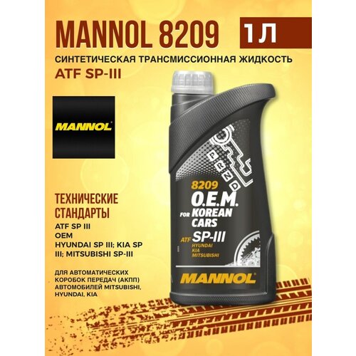 Масло трансмиссионное MANNOL for Korean cars ATF SP-III 1л - специальное трансмиссионное синтетическое масло (ATF) для автоматических коробок передач (АКПП) автомобилей MITSUBISHI, HYUNDAI, KIA. Обеспечивает бесперебойную работу АКПП, гарантирует минимальный износ, продолжительный срок службы трансмиссий и экономию топлива. Разработано на основании требований корейских автопроизводителей.Свойства продукта:- Синтетическая основа высочайшего качества со стабильно высоким индексом вязкости в комбинации с многофункциональным пакетом присадок сохраняет все свои свойства в широком диапазоне температур: обеспечивает хорошие смазочные свойства при низких (-45 °C) температурах зимой и обеспечивает стабильную масляную плёнку при экстремальных нагрузках и температурах летом;- Высокотехнологичная комбинация присадок обеспечивает хорошие антифрикционные свойства для зубчатых зацеплений и необходимые фрикционные свойства для фрикционных элементов, что обеспечивает существенную экономию топлива, плавное без рывков переключение передач и увеличение срока службы всех элементов трансмиссии. Обеспечивает слаженную и плавную работу сцеплений;- Обладает повышенной термоокислительной и химической стабильностью и стойкостью к высокотемпературной термической деградации на протяжении всего срока эксплуатации. Это позволяет снизить образование шлама, лака, нагара и других углеродистых отложений, увеличить интервал замены масла и обеспечить долговечность деталей трансмиссии, что снижает затраты на обслуживание техники;- Защищает от коррозии металлические детали из черных и цветных сплавов как в процессе работы, так и в нерабочем состоянии;- Эффективно противостоит аэрации и пенообразованию;- Обеспечивает совместимость со всеми материалами уплотнений, предотвращает их разбухание, затвердевание и усадку, что позволяет снизить затраты на запчасти и предотвращает утечки;- Снижает шум.Рекомендуется для АКПП автомобилей MITSUBISHI, HYUNDAI, KIA где требуется соответствие требованиям ATF SP-III. Заменяет жидкости предыдущих поколений SP и SP-II Fluid.Цвет: красный.Соблюдайте предписания производителя, указанные в руководстве по эксплуатации!