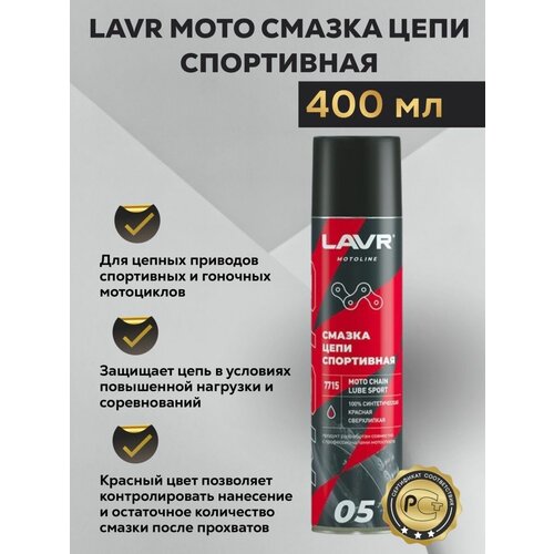 Смазка цепи Спортивная LAVR мото 400мл - красная синтетическая смазка нового поколения разработана для цепных приводов спортивных и гоночных мотоциклов. Защищает цепь в условиях повышенной нагрузки и соревнований. Красный цвет позволяет контролировать нанесение и остаточное количество смазки после прохватов. Присадки, повышающие прилипание, удерживают смазку на цепи при скоростях выше 250 км/ч при любой погоде. Клейкая смазка. Восстанавливает эластичность сальников. Защищает цепь от ударных нагрузок. Для высокоскоростной мототехники. Для дорог с твердым покрытием. Перед обработкой цепь очистить от следов старой смазки и грязи с помощью очистителя цепи Ln7701. Тщательно встряхнуть баллон перед использованием. Нанести средство тонким слоем на внутреннюю часть цепи, медленно поворачивая колесо для обеспечения максимального проникновения. Дать средству высохнуть в течение 10 — 15 минут, после чего его защитные свойства достигнут своего максимума. На поверхности останется красная пленка. Удалить излишки смазки ветошью. Для достижения наилучшего результата использовать при температуре баллона выше +14°C. Избегать попадания смазки на тормозные механизмы!