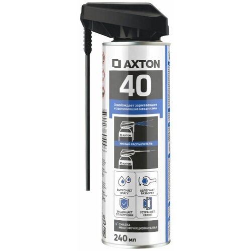 Универсальная смазка Axton 40 эффективно очищает от загрязнений и обеспечивает длительное смазывающее действие. Образует на поверхности пленку, защищающую от коррозии. Улучшает электрическую проводимость контактов, очищает от грязи, препятствует их окислению, предотвращает утечки тока и короткое замыкание.Предназначена для обработки любых резьбовых соединений, петель дверей, механизмов, крепежа, замков, электрического оборудования, трущихся металлических и пластиковых поверхностей и другого применения при уходе за автомобилем, а также в быту и промышленности.При нанесении продукта и работе cо смазкой температура окружающего воздуха не должна быть ниже минус 10°С и выше плюс 30°С. Наносить состав рекомендуется на открытом воздухе или в хорошо проветриваемом помещении.
