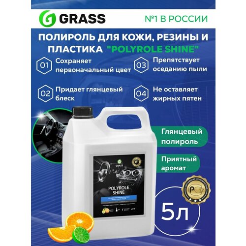Grass. Профессиональный глянцевый полироль, простое в использовании средство для обработки приборных панелей, неокрашенных бамперов, покрышек, для очистки и полировки изделий из пластика, кожи, дерева, винила и резины. Сохраняет первоначальный цвет, не оставляет жирных пятен, препятствует оседанию пыли, придает глянцевый блеск. Средство обладает приятным ароматом. Способ применения: взболтать перед применением, предварительно очистить поверхность от пыли; применять в готовом виде или развести в пропорции 1:1 с водой; равномерно распределить полироль и растереть круговыми движениями по поверхности с помощью губки или салфеткиСпособ применения:1. Предварительно очистить поверхность от сильных загрязнений. 2. Применять в готовом виде или развести в пропорции 1:1 с водой. 3. Нанести полироль с помощью распылителя и распределить равномерно по поверхности круговыми движениями при помощи губки или салфетки.