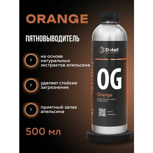 Пятновыводитель OG "Orange" 500мл. Очиститель на основе натуральных экстрактов апельсина. Orange (OG) — это мощный пятновыводитель на основе натуральных экстрактов апельсина. Удаляет стойкие загрязнения с виниловых материалов, ковровой обивки, стеклянных поверхностей, металла, пластмассы, резины, лака, текстиля. Не повреждает поверхность. Эффективно устраняет следующие виды загрязнений: чернила, воск, губная помада, остатки клея, остатки от наклеек, битум, смола, масло, смазка. Orange (OG) отличается приятным запахом апельсина. Способ применения: 1. Нанесите на загрязненную поверхность. 2. Подождите 1-2 минуты. 3. Тщательно протрите область загрязнения чистой салфеткой из неокрашенного текстиля. При удалении каждого слоя загрязнения используйте чистую сторону салфетки. 4. Для 100% удаления остатков глубокого загрязнения с поверхности из текстиля используйте моющий пылесос.