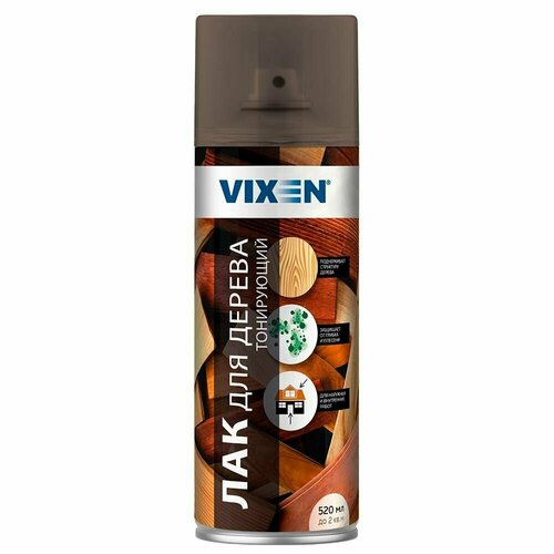 Лак для дерева тонирующий, дуб, аэрозоль 520 мл VX91074 VIXEN. Высокопрочный тонирующий лак для создания защитно-декоративного покрытия на любых деревянных поверхностях. Лак проявляет естественную структуру древесины и придает благородный внешний вид. Применяется для обработки дверей, мебели, декорирования деревянных предметов и других работ по дереву. Лак образует твердое прочное покрытие с высокими защитными свойствами. Фунгицидные добавки в составе защищают от поражения бактериями, насекомыми, грибками. Обработанная поверхности не выгорает под действием ультрафиолетовых лучей, устойчива к воздействию воды и бытовой химии. Окрашенные изделия обладают повышенной устойчивостью к механическому воздействию и истиранию. Лак подходит как для внутренних, так и для внешних работ. Перед нанесением лака подготовьте поверхность: очистите от грязи, хорошо просушите и отшлифуйте. Во избежание попадания следов лака на поверхности, не подлежащие окрашиванию, защитите их пленкой или бумагой. Для получения качесственного покрытия лак использовать при температуре окружающей среды от +10 до +25С. Перед использованием энергично встряхните баллон в течение 2-3 мин. Нанесите лак в 2-3 слоя в зависимости от требуемого эффекта с расстояния 15-20 см. Промежуточная сушка между слоями 10-15 мин. При окрашивании больших по площади поверхностей в промежутках между нанесением встряхивайте баллон. Во избежание засорения головки распылителя рекомендуется по окончании работ продуть сопло, перевернув баллон вверх дном.