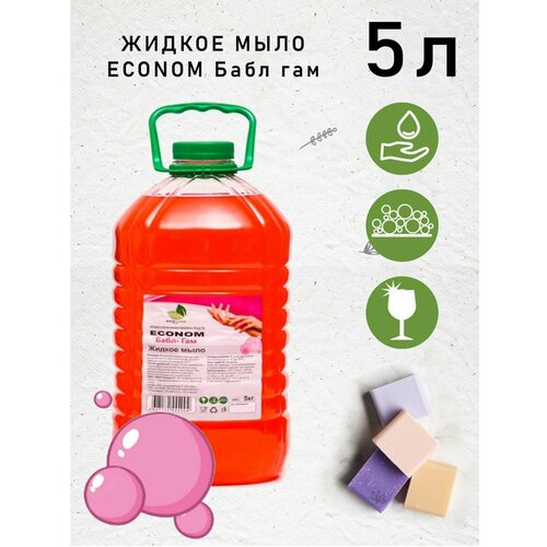 ECONOM - жидкое мыло 5 литров бабл гам хорошо подходит для очищения кожи от любых загрязнений, обладает приятным натуральным ароматом. Жидкое мыло нежно и бережно очищает кожу рук во время мытья. Обладает приятным свежим запахом. Смягчает кожу рук. Его можно использовать в диспенсере или дозаторе для мыла, поскольку он обладает хорошей текучестью и хорошо пениться, при использовании в дозаторе образуется пенка. Жидкое мыло для рук ECONOM 5 литров (5000 мл) с увлажняющим и питающим эффектом. Натуральные компоненты мыла в канистре 5л. ECONOM не только уничтожают микробы, бактерии и вирусы, но защищают кожу вашего тела и рук. Жидкий матовый концентрат средства обладает приятным запахом, что позволяет наслаждаться каждым умыванием. Оно не вызывает раздражения, а наоборот снимает его, питая кожу, а наши компоненты оказывают отличное увлажняющее действие. Жидкое мыло в бутыле 5л. имеет матовую мягкую консистенцию. При использовании туалетного мыла образуется нежная густая пенка, которая бережно очищает ваши руки. Так же наличие хорошей пены позволяет назвать средство экономным за счет оптимального расхода. Жидкое мыло антибактериальное сертифицировано и проверено множеством тестов, полностью безопасно и подходит для взрослых и детей. Его можно использовать для дачи, в офисе, в общественном туалете, ванной комнате, душе и других местах, так же можно мыть фрукты. Подходит для ежедневного мытья рук, лица, тела. Обладает хорошим моющим и очищающим эффектом, экономично в использовании. Обладает приятным запахом. Может быть хорошим подарком. Можно использовать в бане
