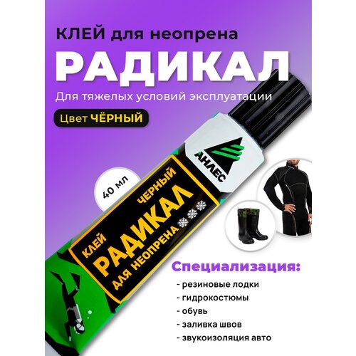 Универсальный неопреновый клей Радикал черный – однокомпонентный особо прочный водостойкий клей, основное функциональное предназначение которого - ремонт обуви, резиновых лодок, гидрокостюмов из неопрена. Клей разработан для тяжелых условий эксплуатации, включая минусовые температуры! Состав клея позволяет его также эффективно использовать этот высокопрочный клей для склеивания в любом сочетании металла, пластиков, стекла, фарфора, керамики, бетона, войлока, ткани, дерева, бумаги. Клей черного цвета, надо это иметь в виду перед его использованием. Химическая основа: клей неопреновый выполнен на основе синтетических каучуков - смеси хлоропреновых каучуков с разной степенью кристаллизации, комплекса усиливающих наполнителей, техуглерода. Области применения: 1) ремонт любых изделий, в том числе и обуви из неопрена (клей для обуви) – латание дыр, заливка швов, устранение порезов. 2) при монтаже звукоизоляционных покрытий в автомобиле, ремонт резиновых ковриков в салоне и в багажнике; 3) приклеивание пластиковых стеновых панелей; 4) применим в качестве клея для кожи и кожзама – склейка, устранение порезов. 5) уникальный состав клея склеивает практически все виды резины, можно использовать как резиновый клей для устранения порезов, разрывов, потертостей. Неопреновый клей восстанавливает поверхность без изменения свойств материала! После застывания место склейки не остается жестким даже на шве!Основные преимущества клея: 1) Широкий температурный диапазон использования изделий, склеенный клеем, – от -40 - +70 градусов. 2) Эластичность. 3) Клеевой шов устойчив как к пресной, так и соленой воде. 4) Клей имеет очень высокое сопротивление отрыву – 18 кг/см. кв. Плотность клея – 0,86 г/см. куб. Внимание: Прочность склеивания зависит не только от применяемого клея, но и от назначения соединения, техники склеивания (применяемого давления, температуры, способа нанесения клея), состояния склеиваемых поверхностей, качества их подготовки к склеиванию, а также от прочности и толщины частей, которые будут склеиваться. Клей поставляется в металлизированном тюбике с удобным удлиненным носиком, 40 мл.