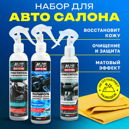 Набор автохимии Очиститель-кондиционер кожи 250 мл, Очиститель винила, пластика, резины 250 мл, Полироль матовая 250 мл, Салфетка микрофибра 35х40см