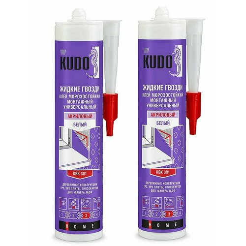 Высококачественный универсальный акриловый морозостойкий клей «жидкие гвозди» KUDO. Объем -280 мл - 2 штуки. Специально разработан для приклеивания изделий из древесины, ДСП, ДВП, EPS, XPS и UPVC на бетонные, кирпичные, каменные, металлические, оштукатуренные и деревянные поверхности. Идеально подходит для сборки деревянных конструкций, приклеивания гипсокартона, OSB-плит, декоративных элементов, подоконников, утеплителей различных видов. Существенно ускоряет отделочные работы, экономичен и прост в использовании. Предназначен для внутренних работ. Не рекомендуется использовать в ванных комнатах и душевых кабинах. Не содержит растворителей, не токсичен и не горюч. Химически нейтральный, не вызывает коррозии металлов. Не имеет запаха. Легко наносится и очищается. После полного отверждения можно окрашивать водными и синтетическими красками. Не подходит для непрерывного погружения в воду.