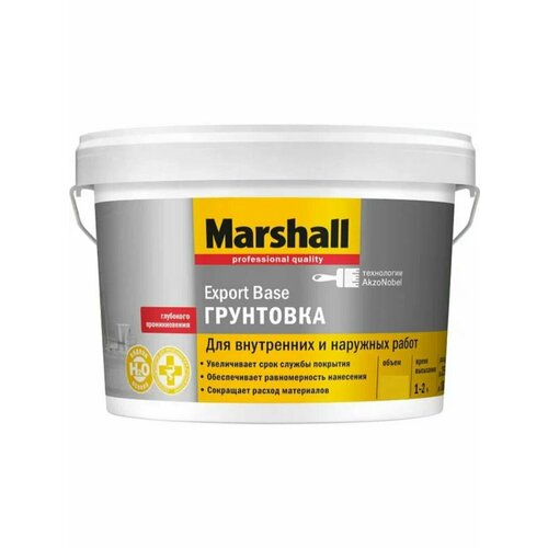 Грунтовка универсальная Marshall Export Base / Маршал Экспорт База глубокого проникновенияУлучшает сцепление между поверхностью и наносимым лакокрасочным покрытием, обеспечивая его долговечность и повышенную износостойкость. Расход: 1л на 10м2Время высыхания: 2-4 часаУпаковка: 2,5 и 10 литровИнструменты: кисть, валикОбласть примененияДля наружных и внутренних работ. Рекомендуется для нанесения на просохшие минеральные поверхности - бетон, штукатурку, кирпич, а также гипсокартон, обои под покраску, предварительно подготовленные ранее окрашенные поверхности. Грунтовка незаменима в ремонтных работах на фасадах зданий. Особенности примененияПеред использованием перемешайте. Поверхность должна быть чистой, сухой и структурно целой. Наносить в один слой кистью или валиком при температуре окружающей среды от +5°С до +30°С и относительной влажности менее 80%.