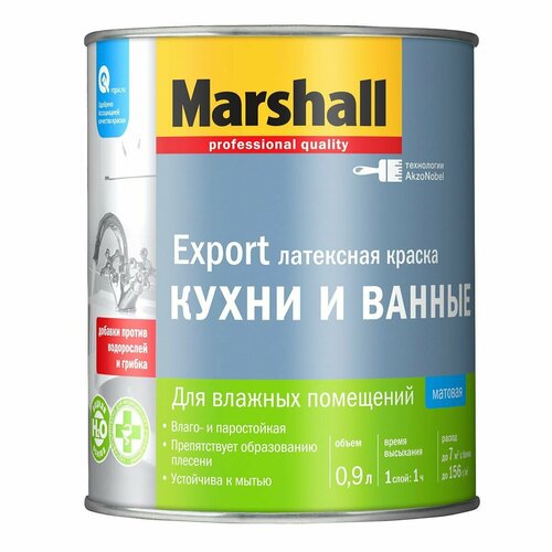 Назначение:Матовая водно-дисперсионная (латексная) краска для помещений с повышенной влажностью, а также повышенной эксплуатационной нагрузкой. Образует покрытие с высокими декоративными свойствами, устойчивое к воздействию пара от бытовых приборов (чайника, пароварки) и образованию конденсата. Входящие в состав краски специальные добавки предотвращают возникновение плесени и водорослей.Область применения:Для внутренних работ. Пригодна для нанесения на полностью просохшие минеральные поверхности (бетон, штукатурка, кирпич и т. п.), гипсокартон, обои под покраску, ДВП. Рекомендуется для окрашивания помещений с повышенной влажностью, таких как кухни, ванные, душевые, прачечные, помещения для сушки белья и пр.Сертифицирована для применения в детских и лечебно-профилактических учреждениях.Свойства: выдерживает воздействие пара и образование конденсата;препятствует возникновению плесени;устойчива к частому мытью с применением мягких моющих средств;без брызг и потеков.Подготовка поверхности и нанесение продукта:Перед применением тщательно перемешать. Для укрепления базовой поверхности, повышения адгезии и уменьшения расхода краски загрунтуйте подготовленную поверхность грунтовкой Marshall Export Base. Рекомендуется наносить в два слоя при температуре от +5оС до +30оС, относительной влажности воздуха от 40 до 80%.Разбавление.Для первого (грунтовочного) слоя разбавить в соотношении не более 1 части воды на 10 частей краски. Для следующего слоя разбавление не требуется.Распыление.Обычное распыление: не более 1 части воды на 10 частей краски — подходит для большинства оборудования.Рекомендуется предварительно подобрать необходимые условия распыления на небольшом участке поверхности.Уход за окрашенной поверхностью.Через месяц после окрашивания поверхность устойчива к мытью с применением мягких моющих средств, возможно небольшое изменение блеска покрытия. Не оставляйте поверхность мокрой после очистки.Условия транспортировки и хранения:2 года при температуре от +5оС до +30оС в невскрытой заводской упаковке.