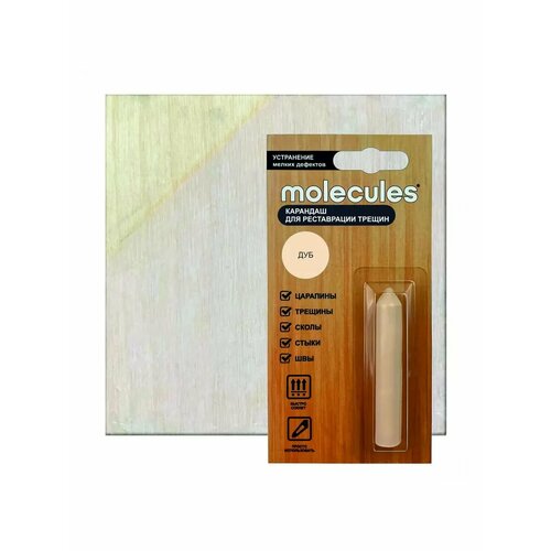 Карандаш для реставрации трещин Molecules оттенка «дуб» предназначен для быстрой маскировки небольших повреждений, царапин, стыков, сколов на деревянной мебели, предметах декора, ламинате, паркетной доске, пластике, поверхностях из ДСП, МДФ и фанеры.Твердый воск можно использовать как в жилых помещениях, так и на террасах и в местах с повышенной влажностью. Подходит для восстановления оконных рам внутри дома, хорошо сцепляется с поверхностью, не смывается, не окисляется, долго сохраняет защитные свойства.Преимущества воскового карандаша:отталкивает влагу;визуально обновляет деревянные поверхности;сохраняет рельеф древесины;излишки легко удаляются спиртом.Длина карандаша — 64 мм. Страна производства — Россия.