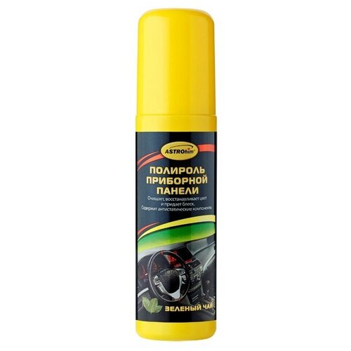 Полироль пластика Астрохим глянцевый зеленый чай спрей 125 мл, Полироль приборной панелиЧистый, ухоженный салон создает более комфортную атмосферу в автомобиле и радует глаз. В особом уходе нуждаются пластиковые детали, которые со временем могут утратить былой эстетичный вид. Это относится к пластиковым элементам любого автомобиля, будь это салон недорогого отечественного автомобиля, либо салон дорогой премиальной «иномарки».Регулярная полировка способна не только сохранить первоначальный вид пластика надолго, но и защитить от факторов, влияющих на его старение, таких, как перепады температур и ультрафиолетовое излучение.Особенности полироля приборной панели ASTROhim.Эффективно очищает и полирует элементы интерьера автомобиля из пластика, винила, резины и кожзаменителя.Придает эффектный глянцевый блеск.Образует на поверхности тонкую полимерную пленку, которая защищает от разрушительного действия ультрафиолетового излучения, предотвращает выгорание и растрескивание пластика.Восстанавливает цвет пластиковой отделки.Предотвращает притягивание пыли к приборной панели, так как содержит антистатические компоненты.Не оставляет жирной и липкой пленки.Обладает приятным ароматом.Не содержит спирт, поэтому безопасен для всех видов пластика.Рекомендации по использованию.Энергично встряхните флакон. Нанесите полироль тонким слоем на обрабатываемую поверхность и располируйте чистой сухой тканью.Внимание! Не используйте под воздействием прямых солнечных лучей и на горячей поверхности. Не используйте на руле, рычаге коробки передач, рычаге ручных тормозов, на педалях – они могут стать скользкими, что может привести к потере управляемости автомобилем.Меры предосторожности.Избегать попадания в глаза. В случае попадания препарата на кожу или в глаза промыть большим количеством воды, при необходимости обратиться к врачу. Не глотать! При попадании вовнутрь вызовите рвоту и обратитесь к врачу. Не вдыхать испарения! Беречь от детей!Условия транспортировки и хранения.Рекомендуется хранить и перевозить при температуре от 0 до +50 °C. Избегать попадания прямых солнечных лучей. Хранить в проветриваемом помещении в плотно закрытой таре.Срок годности 3 года с даты изготовления, указанной на упаковке.
