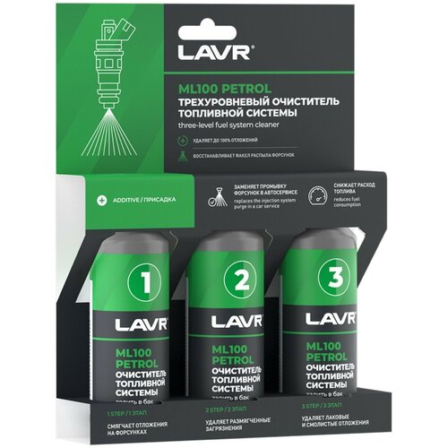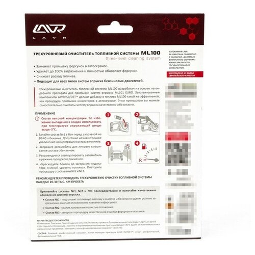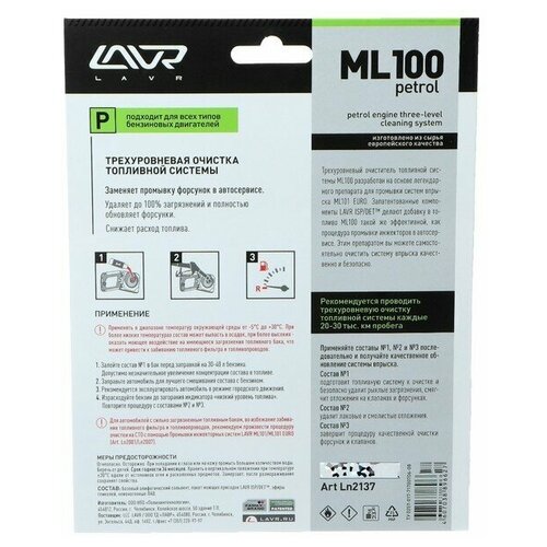 Трехуровневый очиститель топливной системы ML100 PETROL для бензиновых двигателей – это три уникальные присадки, которые заменят промывку форсунок в автосервисе и удалят до 100% загрязнений. Верните автомобилю динамику и экономичность с ML100. Уникальный состав LAVR ML100 подходит для всех типов систем впрыска бензиновых двигателей. Рекомендуется проводить трехуровневую очистку топливной системы каждые 20-30 000 км пробега.Способ применения: Состав высокой концентрации. Во избежание выпадения в осадок использовать при температуре окружающей среды выше -5°C. 1. Залейте состав №1 в бак перед заправкой на 30-40 л бензина. Допустимо незначительное увеличение концентрации состава в топливе. 2. Заправьте автомобиль для лучшего смешивания состава с бензином. 3. Рекомендуется эксплуатировать автомобиль в режиме городского движения. 4. Израсходуйте бензин до загорания индикатора «низкий уровень топлива». Повторите процедуру с составами №2 и №3.