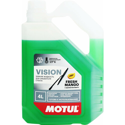 ПрименениеПодходит для всех типов стеклоомывающих систем. Также подходит для системы очистки фар.ХарактеристикиГотовая к использованию жидкость для простого использования. Очищает и обезжиривает лобовое стекло и фары. MOTUL VISION FRESH MANGO имеет приятный запах свежего манго. Высыхает не оставляя следов. Защита от замерзания стеклоомывающей системы и бака до -27,0°C / -16,6°F.Рекомендации по применениюЗалейте MOTUL Vision Fresh Mango прямо в бачок для стеклоомывающей жидкости. Отлично смешивается с другими аналогичными продуктами. Хранить в оригинальной упаковке.Физико-химические свойстваЦветЗеленыйЗапахСвежий мангоПлотность при 20°C/68°F ASTM D40520.959pH ASTM D12877.8Температура кристаллизации-27,0°C / -16,6°F