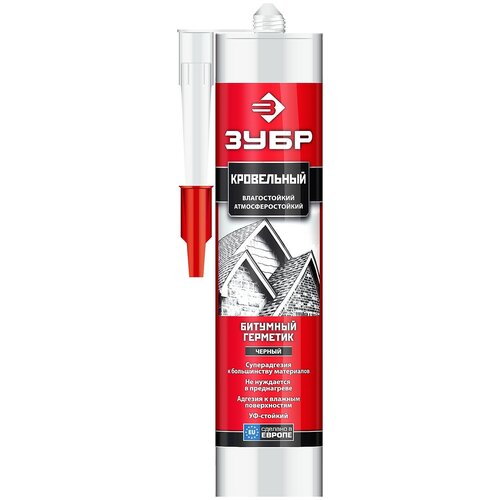 Профессиональный битумный герметик для кровельных работ.ПреимуществаНе нуждается в дополнительном подогреве, готов к применениюХорошо сцепляется даже с влажными поверхностямиСразу после нанесения устойчив к дождюУстойчив к длительному воздействию водыУстойчив к воздействию внешней среды, УФ-излучениюСохраняет заявленные характеристики в широком диапозоне температурЭластиченИспользованиеРекомендуется для работ при монтаже и ремоте кровли. Не пригоден для окрашивания. Герметик ″битумный″ ЗУБР идеален для выполнения высококачественных работ при: - уплотнении и герметизации соединений между битумными рулонами, а также между битумными рулонами и бетонными конструкциями, - уплотнении и герметизации швов между металлическими листами кровли, - герметизации кровельных желобов и водосточных труб.