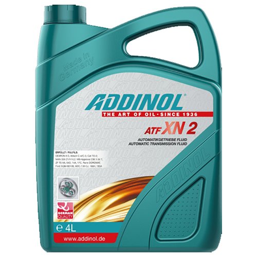 Жидкость для автоматических коробок передач ADDINOL ATF XN 2 изготовлена на основе высококачественных фракций очищенных минеральных масел с добавлением прекрасно зарекомендовавших себя комплексов активных веществ.Успешно применяется в полуавтоматических и автоматических коробках передач легковых, грузовых и коммерческих автомобилей, автобусов, а также в автомобилях специального назначения с замедлителем или без него. Используется в гидродинамических преобразователях.DEXRON TASA, DEXRON D II D, MAN 339 Typ L2, MAN Typ V1, MAN Typ Z1, MB 236.1, Renk – DOROMAT, ZF TE-ML 04D, ZF TE-ML 14A, ZF TE-ML 17C, Allison C3, Allison C4, Caterpillar TO-2, Chrysler MS-6704A, Ford M2C-138 CJ, Ford M2C-166 H, Ford M2C-186 A, Ford SQM-2C9010-A, Ford SQM-2C9010-B, Komatsu Dresser (B22-0004), Voith H55.6335. xx (G607), Volvo 97340, Volvo 97335, Volvo 97325