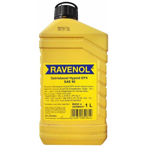 RAVENOL Getriebeoel EPX SAE90 GL-5 – минеральное трансмиссионное масло, изготовленное на основе высокоочищенного минерального базового масла c добавлением комплекса специальных EP (Extreme Pressure) присадок. Надёжно защищает коробку передач и узлы трансмиссии легковых и грузовых автомобилей, внедорожной и специальной техники при экстремально тяжёлых условиях эксплуатации, включая эксплуатацию автотранспорта в городском цикле «Старт-Стоп»Характеристика :Вязкость при 100°C, мм²/с14.3Вязкость при 40°C, мм²/с130.3Вязкость, по Брукфельду при - 26˚C, мПа*с60.100Индекс вязкости VI108Плотность при 20°C, г/cм³882Температура воспламенения, °C222Температура застывания, °C-33Тест на коррозию меди, при 121ºC / 3ч1b.Данное масло обеспечивает:Оптимальные свойства при холодном стартеПрекрасную защиту от износа при зимних условиях эксплуатацииСтабильную масляную пленку, благодаря высокой защите от износа при всех видах нагрузокХорошую устойчивость к сдвигуОчень хорошую стабильность к окислению и отсутствие пенообразованияОтсутствие загустевания масла и образования отложенийИсключительная устойчивость к старениюХорошие вязкостно-температурные свойстваХорошая защита от коррозии, отсутствие ржавления и разъедания цветных металлахНейтрально по отношению к уплотнительным материалам, что предотвращает утечку масла.Соответствует требованиям:ZF TE-ML 17B / ZF TE-ML 05A / ZF TE-ML 21A / MB 235.0 / ZF TE-ML 19BFord SQM-2C-9002 AAMAN 342 M1MIL-L-2105 D