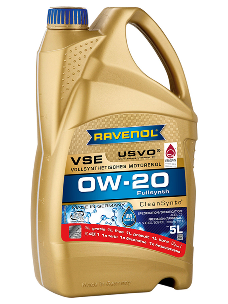 RAVENOL VSE SAE 0W-20 полностью синтетическое моторное масло на основе полиальфаолефинов (ПАО), изготовленное с применением технологий USVO® и CleanSynto® для легковых бензиновых и дизельных моторов с и без турбонаддува и прямым впрыском топлива.