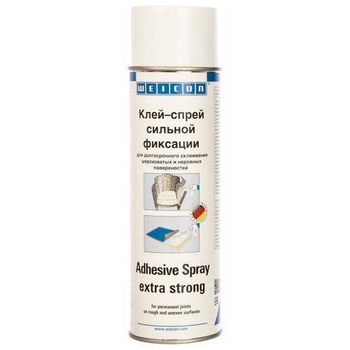 сильной фиксацииСрок годности: 12 месяцаКлей-спрей Weicon [wcn11801500] - удобный в работе аэрозольный клей сильной фиксации, предназначен для склеивания легких материалов большой площади, таких как бумага, текстиль, ковролин, кожа, дерево, резина и т. д.Клей равномерно покрывает всю площадь, заполняя в том числе даже пористые материалы.Область применения: войлок, ПВХ-пленка, искусственная кожа, ковровые покрытия, винил, кожа, синтетический материал, картон, изоляционный материал, мягкий пенопласт, резина, металл, дерево.Применяется в автомобилестроение, мебельной и текстильной промышленности, в рекламе, а также на промышленных объектах для фиксации знаков безопасности, напольной разметки, сигнальных и запрещающих знаков.