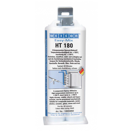WEICON Easy-Mix HT 180 представляет собой 2-компонентный клей на основе эпоксидной смолы и обладает высокой термостойкостью до +180°C; кратковременно до+230°C. Клей обладает высокой вязкостью и стабильностью, что делает его также пригодным для вертикального применения. Он ударопрочен, имеет длительный срок годности, отверждается при комнатной температуре, может быть обработан механическим способом, а его специальные наполнители обеспечивают постоянную линию склеивания. Клей особенно подходит для склеивания композитных материалов и металла и может быть сварен точечной сваркой во время отверждения. Кроме того, Easy-Mix HT 180 может быть использован для пластмасс, керамики, стекла, камня или дерева. Благодаря специальным наполнителям можно добиться постоянной и надежной линии склеивания не менее 0,20 - 0,25 мм. Высокая термостойкость позволяет склеивать компоненты, которые требуют порошкового покрытия после полного отверждения.Технические характеристики:Основа Минерально-наполненная - эпоксидная смолаСтруктура - консистенция пасты, заполнитель трещинЦвет - черныйПропорция компонентов смеси по объему смола/отвердитель (авто) - 1:1Удельная плотность смеси - 1,1 g/cm^3Вязкость смеси при +20°C (+68°F) - пастообразныйТолщина клеевого шва - макс. 4 ммТемпература обработки - от +10 до +40 °CТемпература отвердения - от +10 до +50 °CЖизнеспособность при +20°C (+68°F) 10 мл смеси - 60 мин.Ручная прочность (35% прочности) - после 120 мин.Ручная прочность (50% твердость) - после 4 чОкончательное отверждение (100% прочность) - после 24 чСредняя прочность чистой эпоксидной смолы согласно DIN 1465:Давление - 52 MpaДвижение - 27 MpaИзгиб - 46 MpaТемпература стеклования после отверждения при комнатной температуре - 54,4 °CТемпература стеклования после термической обработки (при 120 °C) - 44,7 °CМодуль Юнга - 2.300 - 2.700 MpaТвердость по Шору, шкала D - 80Средний предел прочности при растяжении и сдвиге в соответствии с DIN EN 1465:Оцинкованная сталь - 8 N/mm^2Сталь, подвергнутая пескоструйной обработке - 23 N/mm^2Подвергнутый пескоструйной обработке алюминий - 13 N/mm^2V2A шлифованный - 24 N/mm^2Твердый поливинилхлорид шероховатый - 11 N/mm^2Углепластики - 22 N/mm^2Линейная усадка - 0,3 %Устойчивость к температурам - от -50 до +180 кратковременно до +230 °CУстойчивость к температурам (23 °C) - 0,172 mm^2/sТеплопроводность - 0,26 W/m·K