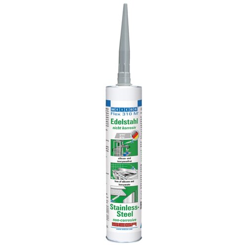 Клей и герметик WEICON Flex 310 M Нержавеющая сталь не вызывает коррозии, прочен, может покрываться лаком «влажным по влажному», шлифуется, устойчив к старению и ультрафиолетовым лучам и не содержит силикона, изоцианатов, галогенов или растворителей. Нержавеющая сталь WEICON Flex 310 M имеет сертификат ISEGA и может использоваться в качестве клея в пищевой технологии. Нержавеющая сталь Flex 310 M также может использоваться во всех областях применения, где где цвет клеящего и уплотнительного материала должен соответствовать цвету основного материала (например, нержавеющая сталь, алюминий и т. д. Нержавеющая сталь WEICON Flex 310 M может использоваться в строительстве с использованием металлических конструкций, в резервуаростроении и аппаратостроении, в пищевой промышленности, при создании кухонного и санитарно- технического оборудования, в вентиляционной технологии и технике кондиционирования воздуха, а также везде, где непригодны силиконы или силиконосодержащие продукты.Технические характеристики:Основа - 1 к.-MS ПолимерПлотность - 1,08 g/cm^3Вязкость - пастообразныйСтабильность/текучесть (ASTM D 2202) - <1 ммТемпература обработки - от +5 до +30 °CТип отвердевания - по влажностиУсловие отвердевания - от +5 до +40°C и от 30% до 95% относ. влажностиВремя образования пленки - 15 мин.Скорость отвердевания (в первые 24 часа) - 3 ммИзменение объема (DIN 52451) - -1 %Макс. зазор при склеивании - 5 ммМакс. ширина клеевого шва - 25 ммСрок хранения (+5°C до +25°C / +41°F до +77°F) - 12 месяцевТвердость по Шору, шкала A (DIN 53505 / ASTM D 2240) ±5 - 45Относительное удлинение при разрыве (DIN 53504/ASTM D412) - 280 %Прочность чистого клея и герметика при растяжении - 3,1 N/mm^2Ср. предел прочности при растяж. и сдвиге (DIN 53283/ASTM D 1002) - 2,5 N/mm^2Прочность на разрыв (DIN 53515/ASTM D 1002) - 11 N/mm^2Поглощение движения - макс. 20 %Класс строительного материала (DIN 4102) - B 2Устойчивость к температурам - от -40 до +90 (кратковременно до 120) °C
