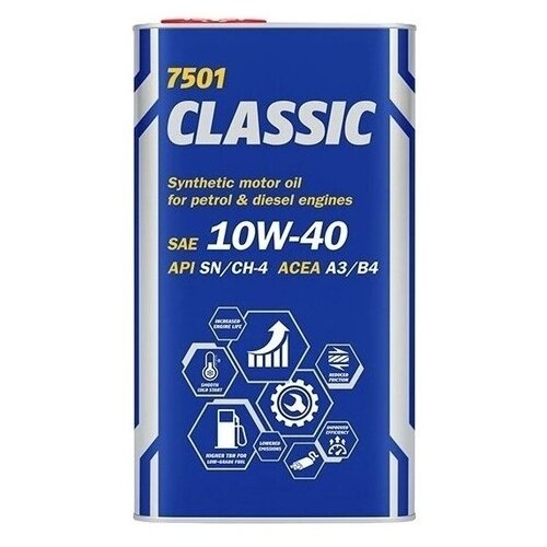 LKSWAGEN 500.00MB 229.3MB 229.1PSA B71 2294RENAULT RN17RENAULT RN0700RENAULT RN0710ПродуктыПолусинтетические моторные маслаClassic Classic 7501Инновационное универсальное ester-содержащее моторное масло на гидросинтетической основе для современных бензиновых и дизельных двигателей с турбонаддувом и без, многоклапанных и с прямым впрыском, в том числе «старых» марок и с большим пробегом. Разработано на основании требований европейских товаропроизводителей.Свойства продукта:- Ester-технология и гидросинтетическая основа с расширенным диапазоном вязкостно-температурных свойств обеспечивает эффективную эксплуатацию двигателя на всех режимах работы: при холодном пуске, в городском режиме, в режиме трассы, а также при повышенной нагрузке (при езде по бездорожью, в гору, движении с прицепом, максимальной загрузке) и при высоких температурах окружающей среды:- Отлично подходит для активной езды и не теряет своих свойств при применении топлива переменного качества (с содержанием серы до 500 ppm) за счёт большого запаса щелочного числа (TBN);- Гидросинтетическая ester-содержащая основа сохраняет мощностные параметры двигателя на протяжении всего интервала между заменами;- Эстеровые компоненты масла в сочетании с уникальным современным пакетом присадок обеспечивают отличные противоизносные и антифрикционные свойства за счёт исключительной прочности масляной плёнки, что в сочетании с хорошей прокачиваемостью значительно увеличивает срок службы двигателя даже в режимах движения "Start-stop" и при холодном пуске;- За счет превосходных моюще-диспергирующих свойств и высочайшей термоокислительной стабильности эффективно борется со всеми видами отложений (в том числе с лаком и нагаром) и поддерживает в чистоте детали двигателя на протяжении всего интервала между заменами;- Подходит для двигателей, работающих на сжиженном природном (LNG) и нефтяном (LPG) газе.Предназначено для бензиновых и дизельных двигателей широкого парка автомобилей (легковых, легких внедорожников, микроавтобусов и легких грузовиков) европейских и других производителей.Рекомендовано для применения в двигателях автомобилей Daimler, VW, Renault предъявляющих дополнительные требования к моторным маслам (согласно указанным выше спецификациям).Масло не предназначено для использования в тяжелых грузовиках и иной подобной технике!