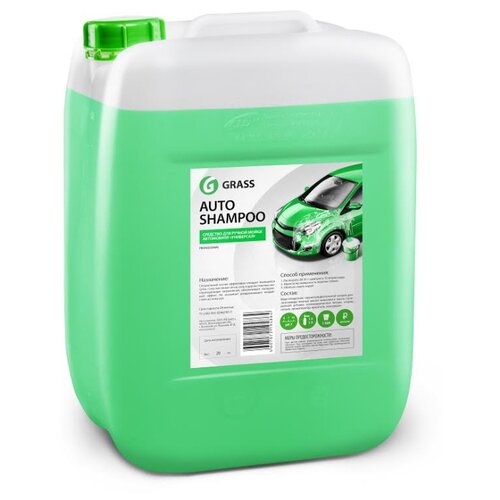 Автошампунь (канистра 20 кг) Grass Auto Shampoo 111103 служит для очистки автомобильного кузова от сажи, солей, масла и прочих загрязнений. После применения средства наблюдается эффект полировки. Вещество поставляется в концентрированном виде и перед использованием разводится обычной водой. Пропорции разведения: 20-30 грамм шампуня на 10 литров воды.