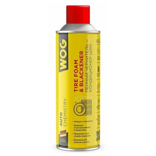 Пенный чернитель -кондиционер шин WOG, 650 мл. Пенный чернитель-кондиционер шин WOG, 650 мл Высокоэффективный пенный препарат очищает и обновляет поверхность покрышки, заполняет микротрещины и возвращает первоначальный цвет. Обильная пена растворяет и удаляет следы пыли, грязи и дорожных реагентов. Препарат формирует на поверхности плотную водоотталкивающую пленку, предотвращающую повторное загрязнение шины. Пена проникает глубоко в микротрещины, заполняет их и предотвращает дальнейшее растрескивание и старение резины. Препарат подходит для ухода за всеми элементами внешней отделки автомобиля из резины и пластика. Рекомендуется применять каждые 2-3 недели и перед сезонным хранением шин. Использовать при температуре не ниже +5С. Препарат можно применять и на влажных покрышках! Тщательно встряхните баллон. Равномерно нанесите состав на поверхность колеса. Дождитесь высыхания препарата в течение 3-4 минут. При необходимости - повторите обработку. После нанесения на пластиковые элементы- тщательно располируйте состав.