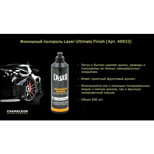 Финишный полироль/Антиголограмма Laser Ultimate Finish - легко и быстро удаляет дымку, разводы и голограммы на темных лакокрасочных покрытиях. Чрезвычайно мелкие гранулы гарантируют надежное удаление мельчайших дефектов лакокрасочного покрытия и микроцарапин. Имеет приятный фруктовый аромат. Используется как с помощью полировальных машин с мягким диском, так и вручную полировочной тканью. Остатки полироля можно убрать салфеткой из микрофибры.Рекомендуемая температура обработки должна быть не менее +10 °C и макс. влажность воздуха не должна превышать 80%.pH: 8. Вязкость: 8000-13000. Относительная плотность: 0,99Срок годности: 2 годаТемпература хранения: 15°C - 25°C.