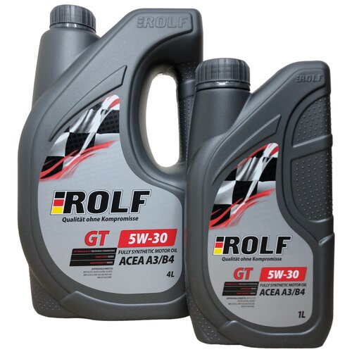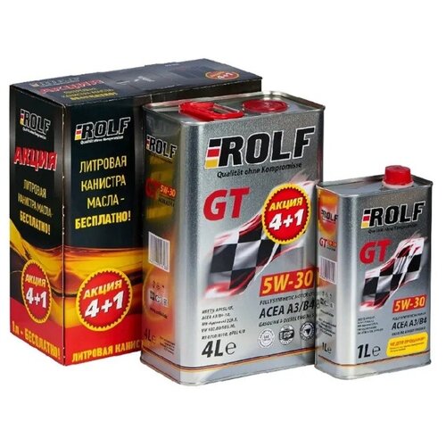 ROLF / моторное масло ROLF GT 5W-30 A3/B4 API SL/CF, синтетическое, акция 4 л + 1 л / синтетика / 5W30 /ОписаниеПолностью синтетическое моторное масло, предназначенное для максимальной защиты бензиновых и дизельных двигателей современных автомобилей, работающих в различных условиях эксплуатации. Обеспечивает быстрый и легкий запуск двигателя при самых низких температурах, превосходную защиту двигателя от износа и увеличенный интервал замены. Предотвращает образование отложений в масляной системе, имеет повышенную стойкость к топливу переменного качества (с содержанием серы до 500 ppm).ПрименениеROLF GT 5W-30 ACEA A3/B4 применяется в бензиновых и дизельных двигателях с высокими эксплуатационными характеристиками в легковых автомобилях, в том числе с турбонаддувом и системами нейтрализации отработавших газов. Для всесезонного применения. Рекомендовано как для новых двигателей, так и для двигателей с большим пробегом.Ключевые особенности• Прекрасная термическая и анти-окислительная стабильность масла минимизирует образование отложений и шлама• Улучшенная защита от износа продлевает срок службы двигателя и его узлов.• Способствует сбережению топлива и снижению до минимума расхода на угар.• Синтетическое базовое масло придает превосходные низкотемпературные эксплуатационные свойства.• Одобрено ведущими мировыми производителями к применению. • Обеспечивает увеличенный интервал замены моторного масла.Допуски и соответствияAPI SL/CFACEA A3/B4 A3/B3МВ 229.5VW 502.00/505.00RN 0710/0700