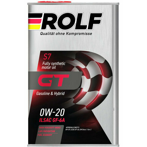 Полностью синтетическое моторное масло ROLF GT SAE 0W-20 API SP, ILSAC GF-6A производится из высококачественных синтетических базовых масел и новейшего многофункционального пакета присадок. Обеспечивает улучшенную защиту от преждевременного воспламенения топливной смеси в цилиндре (LSPI), разрушительно действующую на современные турбированные бензиновые моторы с непосредственным впрыском топлива. Отвечает повышенным требованиям к экономии топлива, защите цепи ГРМ от износа и противодействию образования нагара на поршнях в самых жестких условиях эксплуатации.ключевые особенностиЗа счет образования прочной смазочной пленки идеально подходит для режима езды старт-стопОбеспечивает защиту современных двигателей от явлений низкоскоростного предварительного зажигания (LSPI - Low Speed Pre-ignition)Удовлетворяет самым новым требованиям предъявляемым двигателями японских и корейских автомобилейПрепятствует образованию отложений и шлама, поддерживая чистоту двигателя во время всего срока службыОбеспечивает быстрый и лёгкий запуск двигателя при низких температурах окружающего воздухаприменениеПредназначено для применения в самых современных бензиновых двигателях японских, корейских и американских автомобилей, особенно оснащённых турбонаддувом и непосредственным впрыском топлива, где требуется топливная экономичность, защита от LSPI и наивысший уровень эксплуатационных свойств ILSAC GF-6 включающий в себя требования стандартов API SP и API SP Resource Concerving. Рекомендовано там, где требуются смазочные материалы эксплуатационного класса API SP (или более ранних спецификаций) и соответствующего класса вязкости SAE 0W-20.физико-химические свойстваТипичные характеристики Норма по НТД Фактические показателиПлотность при 15°С, г/см3 определениеобязательно 0,845Индекс вязкости определениеобязательно 175Кинематическая вязкость при 100°С, мм2/с 5,6 - 9,3 7,5Щелочное число, мг KOH/г не менее 6 7,1Сульфатная зольность, % не более 1,3 0,7Испаряемость, % не более 15 10,3Температура вспышки в открытом тигле, °С не ниже 200 236Температура застывания, °С не выше -42 -45