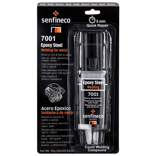 Двухкомпонентный клей предназначен для быстрого и надежного структурного соединения стали, алюминия, латуни, меди, железа, олова, свинца и различных сплавов. Продукт развивает высокую прочность на различных материалах и является водостойким, является универсальным клеем, который идеально подходит для многих применений "Сделай сам". Высокая термостойкость 150°C. Конечная прочность до 120 кг/см2. Применение:Очистить и обезжирьте поверхность детали. Снять колпачок со шприца, проткнуть трубки с отвердителем и смолой. Выдавить равное количество из обеих трубок и тщательно перемешать до получения однородной массы. Нанести тонким слоем на подготовленные к склеиванию поверхности в течение 5 минут. Удалите излишки. важно: После смешивания компонентов продукт эластичен в течение 5 минут, склеивает через 30 минут и полностью затвердевает через 24 часа.