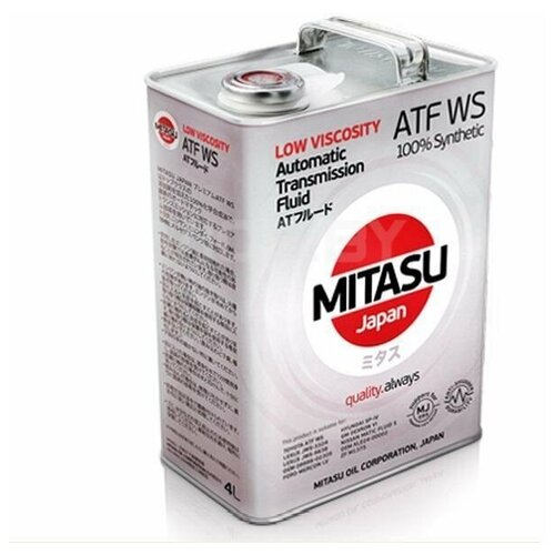 MITASU ATF WS Synthetic Tech – низковязкая жидкость для современных автоматических трансмиссий, изготовленная по синтетической технологии. Обладает прекрасными противовибрационными свойствами, отвечает международным стандартам и требованиям TOYOTA, AISIN WARNER и GM для автоматических трансмиссионных жидкостей типа ATF WS. Цвет жидкости красный.применениеMITASU ATF WS Synthetic Tech предназначена для современных автоматических трансмиссий AISIN WARNER, устанавливаемых на автомобили TOYOTA, LEXUS и GM. Также может использоваться в автоматических трансмиссиях, установленных на автомобилях других производителей, если для них рекомендована жидкость ATF WS.продукт отвечает требованиям∙ TOYOTA / LEXUS / SCION ATF WS∙ TOYOTA / LEXUS / SCION 08886-02303∙ TOYOTA / LEXUS / SCION 08886-02305∙ TOYOTA / LEXUS / SCION 08886-80803∙ TOYOTA / LEXUS / SCION 08886-80807∙ TOYOTA / LEXUS / SCION 08886-81210∙ AISIN WARNER NWS-9638 / 9638 T5∙ AISIN WARNER JWS-3324∙ GM 88863400 / 401преимуществаMITASU ATF WS Synthetic Tech обеспечивает:∙ Экономию топлива∙ Уровень качества, заданный производителями OEM (Original Equipment Manufacturer)∙ Стабильные эксплуатационные характеристики в широком диапазоне температур∙ Улучшенные показатели противовибрационной устойчивости∙ Корректную работу автоматических трансмиссий в различных режимах эксплуатации∙ Превосходную защиту от износаНовейшие технологии MITASU OIL CORPORATION, Japan позволяют выпускаемым компанией жидкостям для автоматических коробок передач превосходить требования таких производителей автомобилей, как: TOYOTA, LEXUS, DAIHATSU, GM и многих других.