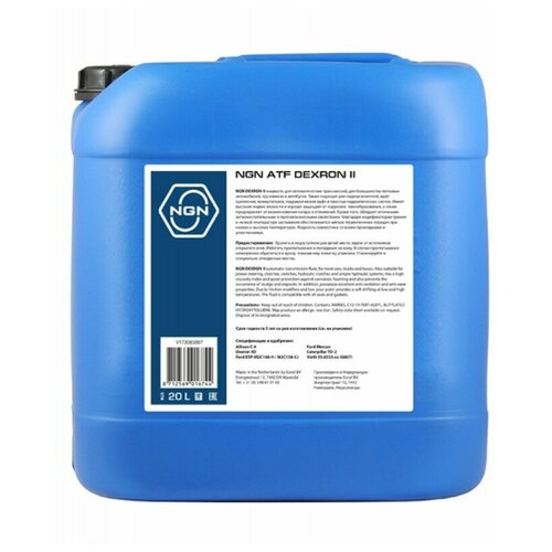 Код товара для заказа: NSIN0018146152;Артикул: V172085807;Бренд: NGN;характеристики.Вид жидкости: DEXRON II;Состав: минеральное;Объем канистры: 20 л;Назначение: автоматическая (AT), гидроусилитель руля (PSF);Допуски OEM: Ford ATF Mercon, Ford WSS-M2C138-CJ, Ford ESP-M2C166-H, GM DEXRON II D, Caterpillar TO-2, Allison C-4, VOITH G607, VOITH H55.6335.34, ZF TE-ML 09, ZF TE-ML 11, ZF TE-ML 14, MB 236.1, MB 236.5, MB 236.7, MB 236.9, MAN 339V1, MAN 339Z1, MAN 339D, Denison HF-0;Масло трансмиссионное NGN ATF DEXRON II минеральноеТрансмиссионная жидкость на минеральной основе для автоматических гидромеханических трансмиссий легковых автомобилей, легких грузовиков и автобусов европейского, американского и японского производства.Преимущества• Высокоэффективные присадки защищают от износа подшипники и шестерни, обеспечивая чистоту и длительный срок службы агрегатов трансмиссии• Создано с применением новейшей фосфорно-серной технологии. Данная технология обеспечивает надежную защиту от износа при экстремальных условиях эксплуатации• Обладает прекрасной термостойкостью и антиокислительными характеристикамиФизико-химические свойстваПлотность при 15°C, г/см³: 0,866Вязкость при 40°C, мм²/с: 36,1Вязкость при 100°C, мм²/с: 7,4Индекс вязкости: 177Температура застывания, °C: -42Температура вспышки, °C: 209Соответствие спецификациям• Ford Mercon, M2C-138CJ/M2C-166H;• GM Dexron II D;• Caterpillar TO-2;• Allison C-4;• Voith G 607/ H55.6335.34;• ZF TE-ML 09/11/14;• Mercedes Benz 236.1/5/7/9;• Denison HF-0;• MAN 339D, 339 V1 & 339 Z1;