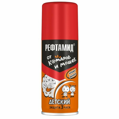 Репеллент Рефтамид Детский - средство для защиты детей от укусов кровососущих насекомых (комаров, мокрецов, москитов). Состав разработан с учётом особенностей чувствительной детской кожи. Детям с трёхлетнего возраста средство наносится на одежду, с пятилетнего возраста на открытые части тела. Сохраняет своё действие в течение 2 часов. Обладает ароматом сочных ягод.