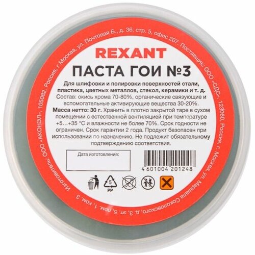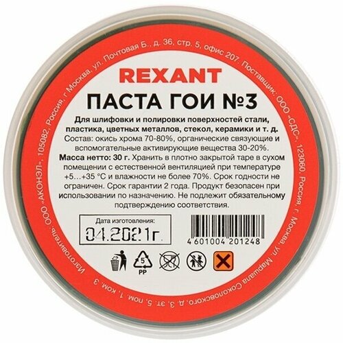 Полировальная паста ГОИ № 3 REXANT для средней шлифовки и полировки поверхностей, банка 30 грамм