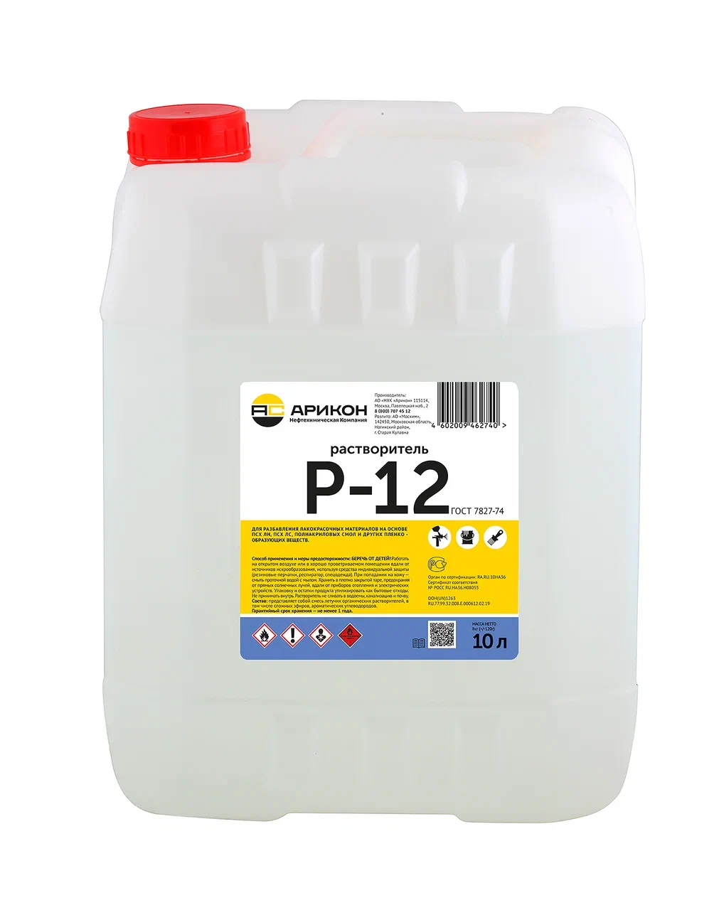 Растворитель Р-12 ГОСТ 7827-74Предназначен для:- разбавления лакокрасочных материалов на основе ПСХ ЛН и ПСХ ЛС (эмали: ХВ-533, ХВ-785, ХВ-1120, АК-194), полиакриловых смол и других пленкообразующих веществ.- промывания и очистки лакокрасочных инструментов: кистей, валиков, емкостей.- промывания лакокрасочного технического оборудования: краскопульта, сопла, емкости для краски и пр.Применяется в автомобильной промышленности и быту.Применение:Разбавление краски до необходимой консистенции: добавить растворитель в емкость согласно рекомендациям производителя ЛКМ (указано на этикетке с маркировкой краски) и тщательно перемешать. В случае, не правильного или длительного хранения краски, в ней могут образоваться сгустки. Растворитель рекомендуется добавлять постепенно, тщательно растирая сгустки и перемешивая, до полного их исчезновения. Перед применением, краску процедить.При применении краскопульта эмаль / лак / грунтовку разбавлять в зависимости от диаметра сопла и планируемой толщины пленки покрытия от 1:1 до 1:15.Промывание и очистка инструментов и технического оборудования: налить растворитель в емкость, положить в нее необходимый для очистки инструмент и / или техническое оборудование. Прополоскать в растворителе и оставить до полного растворения краски, (кисти и валики необходимо периодически отжимать и вновь опускать в растворитель), протереть инструмент ветошью и промыть проточной водой с мылом, для удаления остатков растворителя.Внимание! Хранить в недоступном для детей месте! Не принимать внутрь! Работать на открытом воздухе или в хорошо проветриваемом помещении, вдали от источников искрообразования, используя средства индивидуальной защиты (резиновые перчатки, респиратор, спецодежда). При попадании на кожу – смыть проточной водой с мылом. Легко воспламеняющаяся жидкость, хранить в плотно закрытой таре, предохраняя от прямых солнечных лучей, вдали от приборов отопления и электрических устройств. Упаковку и остатки продукта утилизировать как бытовые отходы. Растворитель не сливать в водоемы, канализацию и почву.Состав: смесь летучих органических растворителей, в том числе сложных эфиров, ароматических углеводородов и кетонов.Внешний вид: бесцветная или слегка желтоватая однородная прозрачная жидкость без видимых взвешенных частиц.Гарантийный срок хранения: не менее 1 годаФасуется в объемы тары: 0,5л; 1л; 5л.; 10л.; 21,5л.Оптовая поставка: 50л (барабан), 216,5л (евробочка), 1000л (еврокуб), бензовоз.Для промывки лакокрасочного оборудования, согласно марки указанной на этикетке.Для разбавления лакокрасочной продукции, согласно марки указанной на этикетке.Для малярных работ.