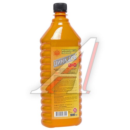Преобразователь ржавчины для авто с цинком 1000 мл агат Цинкарь / Антиржавчина автомобильная / Удалитель (нейтрализатор) коррозии. Преобразователь ржавчины «Цинкарь» - эффективное средство защиты металлических поверхностей от коррозии. Данное защитное средство было создано в 2002 г, и сочетает электрохимический и консервационный методы. Прежде всего, оно предназначается для обработки внешних частей автотранспортных средств, но может применяться и для защиты деталей иных механизмов и строительных конструкций. Область использования «Цинкарь» предназначается для защиты от ржавчины любых конструкций, находящихся под воздействием агрессивных веществ - прежде всего, сырости. Это широкий спектр металлоизделий, эксплуатирующих на открытом воздухе. Согласно инструкции, имеющейся на упаковке, преобразователь подойдёт для обработки широкого спектра металлоизделий: Автомобильных гаражей, киосков, боксов; Опор линий электропередач; Несущих конструкций металлических мостов; Ограждений и декоративных садово-парковых конструкций. Особо полезен «Цинкарь» будет автовладельцам. Эксплуатация автомобиля, даже в городе, всегда происходит в тяжёлых условиях. Инструкция по использованию Для большей эффективности использования преобразователя необходимо соблюдать инструкцию по нанесению защитной жидкости. Порядок нанесения Перед нанесением «Цинкаря» обрабатываемую поверхность предварительно подготавливают. Подготовка заключается в тщательной очистке поражённого коррозией места от отслаивающихся частиц ржавчины и старой краски. Для этого можно использовать шпатель, жёсткую щётку, крупную наждачную «шкурку», либо просто нож. Далее необходимо подготовить к нанесению сам преобразователь ржавчины. На дне ёмкости со временем неизбежно образуется осадок, который образуют растворённые соли металлов. Поэтому, флакон или канистру, где находится «Цинкарь», необходимо хорошенько встряхнуть, и лишь потом наносить на обрабатываемую поверхность. Все рабочие компоненты, входящие в состав антикоррозийного средства, будут равномерно распределены по всему объёму. Окрашивать поражённую ржавчиной поверхность можно простой кистью или валиком. Правда, в этих случаях увеличивается расход материала. Для экономии рекомендуется применять флаконы преобразователя ржавчины, снабжённые насадкой-распылителем. В ситуации, когда требуется обработать большую по площади поверхность, можно воспользоваться малярным краскопультом. Это позволит нанести средство тонким равномерным слоем. Средний расход средства от ржавчины составляет до 350 мл на м2 при нанесении в один слой. Допускается, для усиления защитного эффекта, наносить антикоррозийную жидкость в два-три слоя. При этом последующий слой наносится только после полного высыхания предыдущего. Срок высыхания слоя зависит от температуры и влажности окружающего воздуха. В среднем это получаса до 1,5 часов – судить о высыхании можно по появлению серовато-белого налёта. Смывка жидкости После окончания работы с антикоррозийным средством следует подождать его полного высыхания, и протереть место нанесения сухой ветошью. Оставшийся на поверхности налёт серого или белого цвета можно убрать специальной смывкой на основе силикона, органическими растворителями (уайт-спиритом, ацетоном) или просто тряп