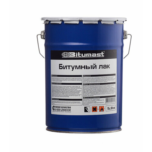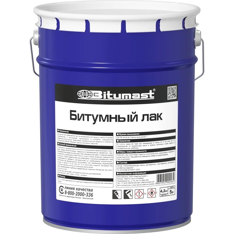 Битумный лак- антикоррозионная защита металлических поверхностей от воздействия атмосферной влаги. Консервация металлических изделий в межоперационный период или при хранении в условиях повышенной влажности. Защита деревянных конструкций от гниения и поражения грибками.Битумный лак - состав на основе нефтяного битума, органического растворителя, плёнкообразующей смолы, ингибитора коррозии и антисептика.Содержит высокоэффективный ингибитор коррозии и антисептик, препятствует возникновению подплёночной коррозии. Не содержит толуола и других токсичных растворителей.Производство работПеред применением, битумный лак тщательно перемешать по всему объёму. При необходимости возможно разбавление уайт-спиритом, сольвентом или бензином-растворителем (не использовать автомобильный бензин, так как пары его могут быть ядовиты. При нанесении битумного лака, поверхность должна быть сухой, предварительно очищенная от грязи, непрочных остатков старого покрытия, снега и наледи. Ржавые металлические поверхности зачистить механическим способом и обработать преобразователем ржавчины Bitumast. Битумный лак наносится при помощи малярного валика, кисти, швабры или методом распыления в 2 слоя с промежуточной сушкой не менее 6 часов.ХранениеХранить в плотно закрытой таре при температуре от минус 30 градусов до плюс 50 градусов. Предохранять от воздействия влаги и прямых солнечных лучей, вдали от нагревательных приборов и открытых источников огня. Не хранить в жилых помещениях и в контакте с продуктами питания. Держать в недоступном для детей месте. Гарантийный срок хранения при условии герметичной упаковки - 24 месяца. Гарантийный срок продукции в металлической таре - 36 месяцев.Меры предосторожностиНе использовать внутри жилых помещений. Битумный лак огнеопасен! Работы с битумным лаком проводить на открытом воздухе, при работе в помещении необходимо обеспечить приточную вентиляцию, не курить. Исключить наличие нагревательных приборов и открытых источников огня. Не допускать попадания битумного лака на кожные покровы, в глаза и пищевод, применять защитные костюмы, перчатки и очки. При попадании битумного лака на кожу - удалить ветошью и смыть загрязнение мыльной водой. При попадании битумного лака в глаза - промыть большим количеством проточной воды и при необходимости обратиться за медицинской помощью. При попадании битумного лака в пищевод - НЕ вызывать рвоту, немедленно обратиться за медицинской помощью и показать этикетку.