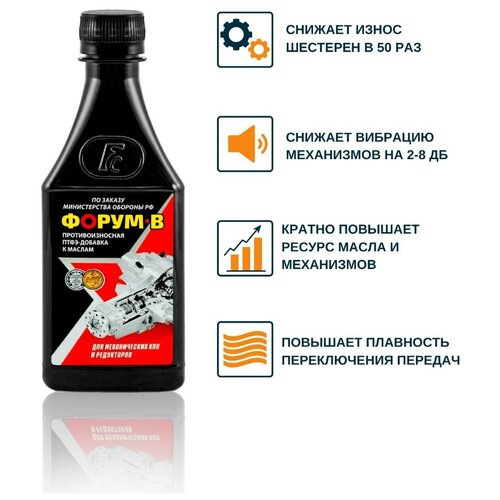 Форум-в для МКПП и редукторов всех типов предназначен для защиты редукторов и механических коробок переключения передач автомобилей, работающих при высоких температурах и нагрузках. Добавка совместима со всеми типами трансмиссионных масел