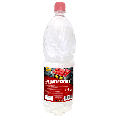 Электролит для кислотных аккумуляторов 1.5л плотностью 1.27г/куб. см. Готовый к применению кислотный электролит. Предназначен для заливки в тяговые и стартерные аккумуляторы. Произведен на основе высококачественной серной аккумуляторной кислоты и дистиллированной воды высокой степени очистки. Отличительные особенности: продлевает срок службы всех марок кислотных стартерных аккумуляторов.