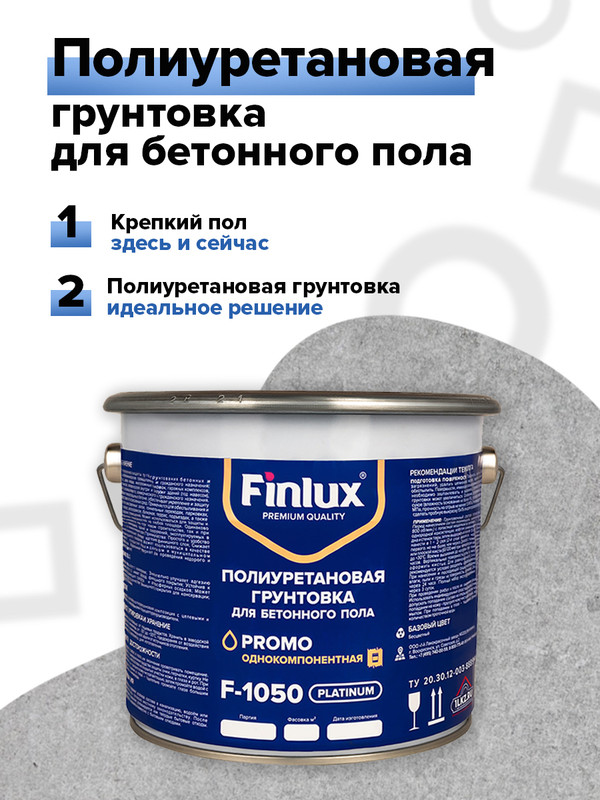 Полиуретановый грунт ( пропитка) Finlux F-1050 Platinum. Предназначен для защиты бетонных полов путём обработки (грунтования) бетонных или асфальтобетонных полов промышленного и гражданского назначения: складов, цехов, ангаров, многоэтажных парковок, гаражных комплексов, автосервисов, автомастерских внутри и снаружи зданий (под навесом), объектов промышленного, коммерческого и гражданского назначения. Получаемое покрытие перекрывает микротрещины в бетоне, обеспечивает укрепление и защиту цементных стяжек от агрессивных сред. Применяется для обеспыливания и защиты полов в выставочных залах, тоннельных переходах, парковках, гаражах, автомойках, автосервисах, балконах, террасах, подъездах, а также для торгово-складских помещений. Может использоваться для защиты и укрепления бетонных поверхностей и для плит OSB на любой площади. Одинаково эффективно применяется как при новом строительстве, так и при реконструкции имеющихся зданий и сооружений, эксплуатируемых в условиях всех климатических зон.Грунт полиуретановый ( полимерный ) Финлюкс может использоваться в качестве финишного покрытия в гражданском и муниципальном строительстве. Идеальный материал для проведения недорогого и надёжного ремонта.Finlux - запатентованная экспортная торговая марка известного российского производителя 1-ый Лакокрасочный завод с 1989 года. Грунтовка производится на финских и японских полимерах.Finlux- Покрасит даже Лось!Может использоваться как - Влагозащитная, Гидроизоляционная, Глубокого проникновения, Укрепляющая, Пропиточная, Универсальная, Антикоррозийная.Работает при любых температурах и храниться. Не замерзает.Finlux F1050 Platinum превосходит все водные акриловые, водно-дисперсионные грунтовки на порядок по износостойкости, водо-отталкиванию и сроку службы. Поднимает марку бетона, укрепляет и улучшает качество бетонного пола.Может применяться как специальная грунтовка в качестве грунтующего материала для обработки швов и пористых поверхностей из бетона, железа, стали, пластика, стекла, стеклопластика, древесины, перед герметизацией или склейкой полиуретановыми герметиками и клеями.Полиуретановая грунтовка Finlux , прекрасно изолирует , повышает цепкость склеиваемых материалов, наносится тонким слоем валиком или кистью.Может выступать антикоррозийным покрытием для стальных и металлических конструкций и защищать бетонные , деревянные, металлические покрытия от морской воды.Гидрозащита, обеспыливание и упрочнение: бетон, кирпич старые рулонные покрытия. Антикоррозионная защита металлических конструкций. Защита резервуаров для хранения технической и питьевой воды, пищевых продуктов, химических веществ, трубопроводов. Защита дерева, ДВП, шпона и т. д. от воздействия морской воды. Технологичен и удобен для нанесения. Высокая стойкость отвержденной пленки к истиранию. Эффективное сопротивление механическим и ударным нагрузкам. Высокая поверхностная активность, позволяющая значительно улучшить адгезию последующих покрывных слоев. Сохраняет гибкость, в том числе и при отрицательных температурах.Finlux PRIMER грунт полиуретановый может применяется при укладке различных видов напольных покрытий на бетонные, деревянные, металлические и прочие основания. Глубоко пропитывает, уплотняет и укрепляет верхний слой основания. Повышает адгезию клея, связыв