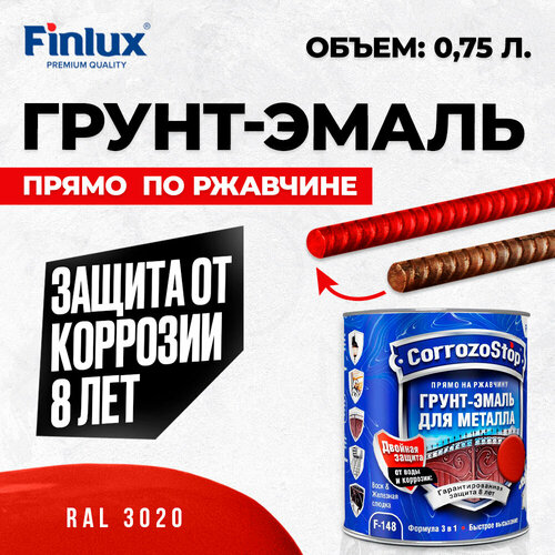Универсальная грунт-эмаль 3в1 по металлу и ржавчине Finlux F-148, глянцевая, ral 3020, 0,75 л